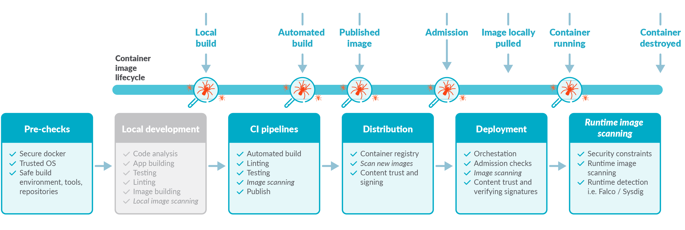 イメージのスキャンは、コンテナを実行する前に潜在的な問題を検出するためのもう 1 つの方法です。イメージスキャンのベストプラクティスを順守するには、イメージがコンテナレジストリにプッシュされたときだけでなく、イメージのライフサイクルのさまざまな段階でスキャンを実行する必要があります。